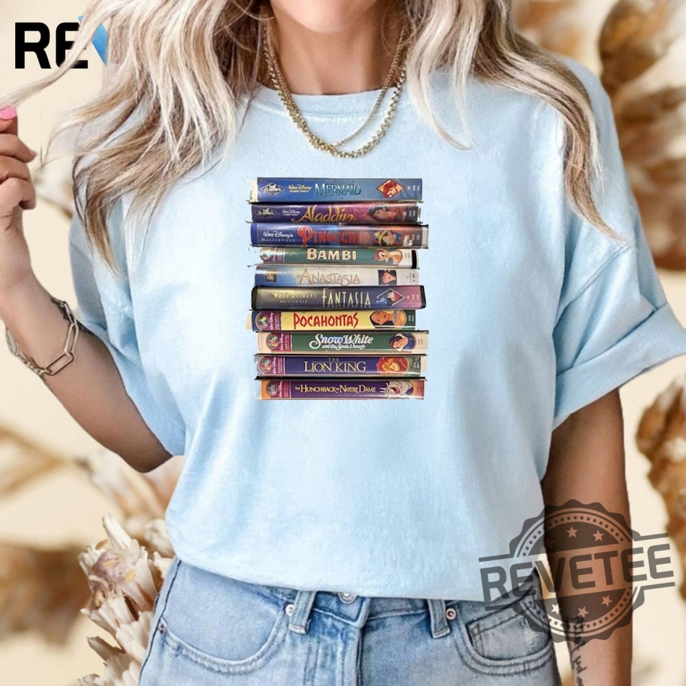 Love Classic Lion King Little Mermaid Snow White More Movie Stacked Vhs Tapes T Shirt? Personalize it your way with our custom options! Choose your design, colors, and style to reflect your personality, convey a special message, or craft a one-of-a-kind gift.