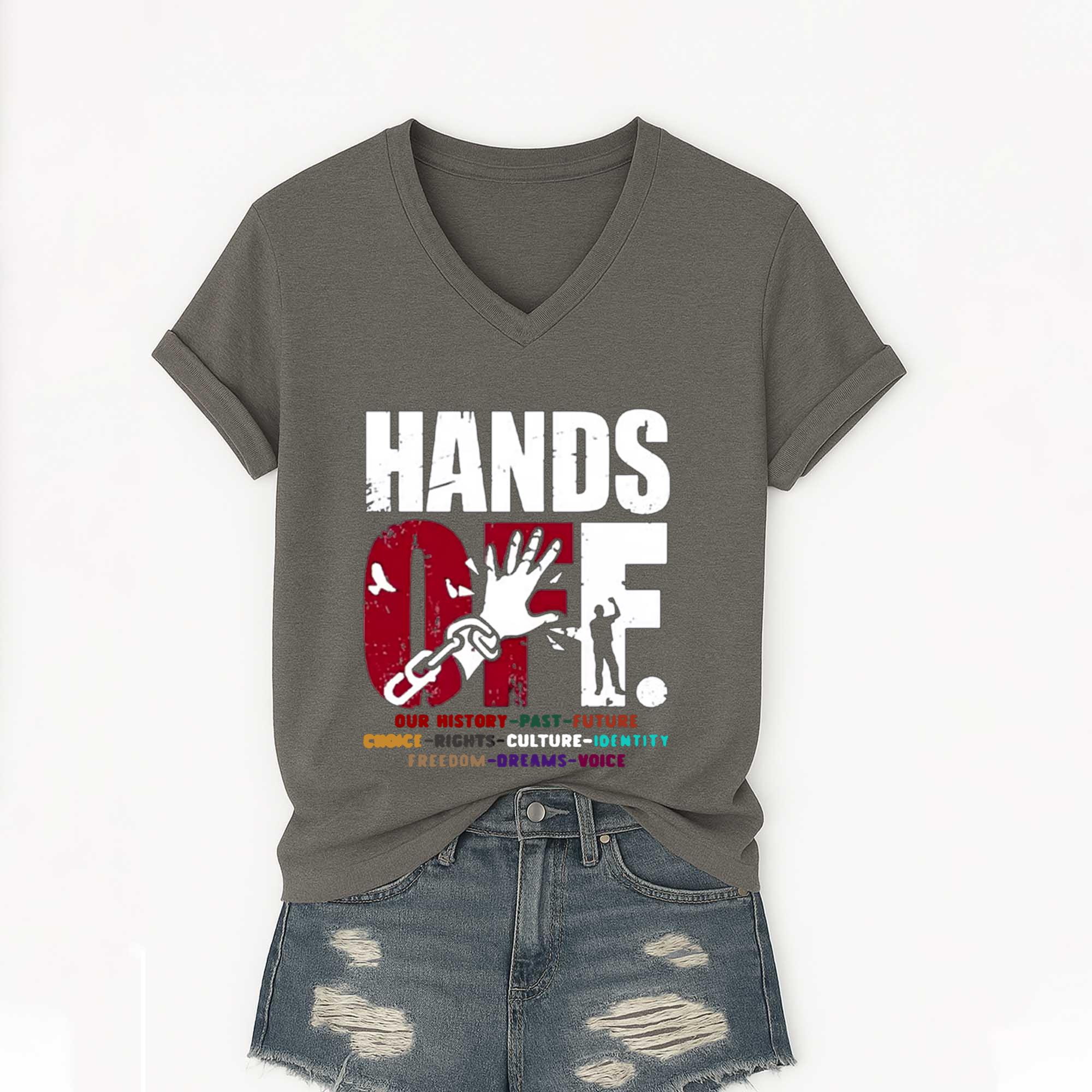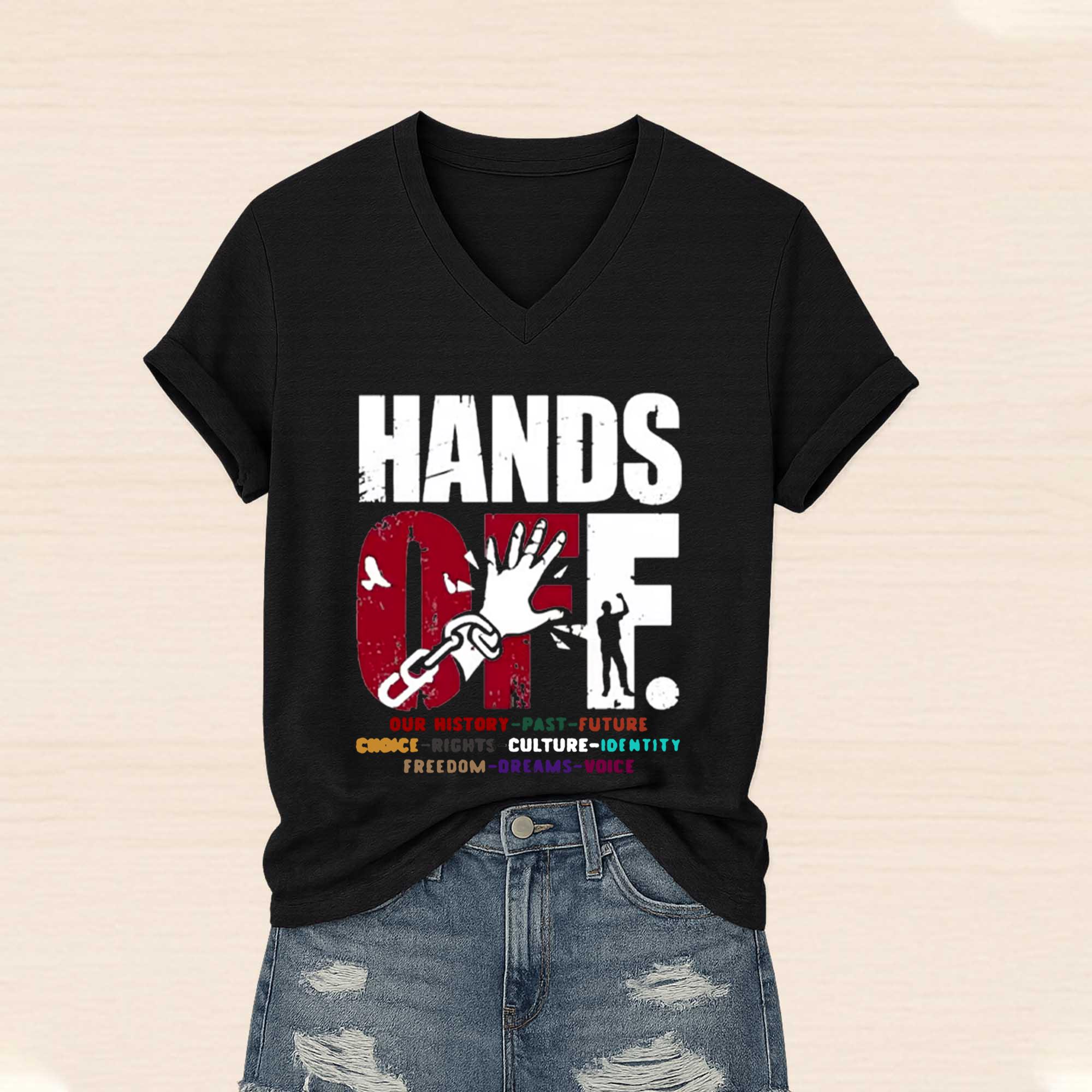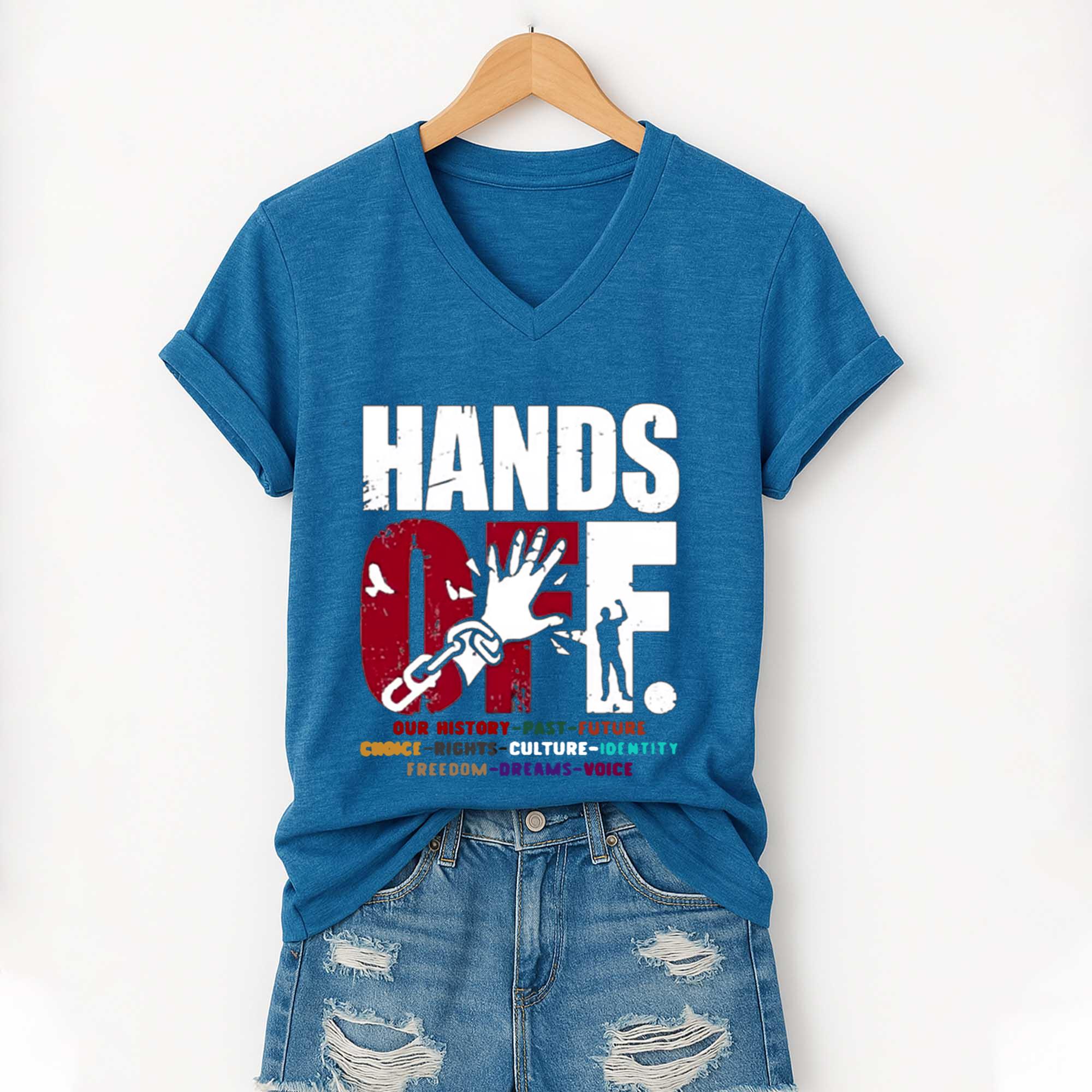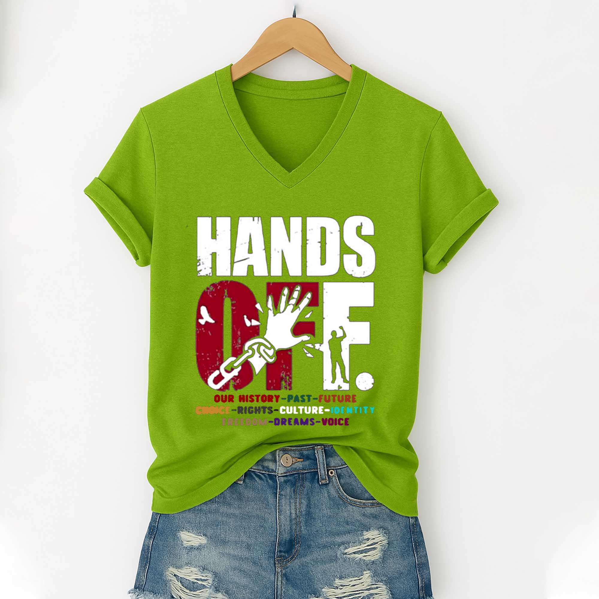 Love Hands Off V-Neck T-Shirt? Personalize it your way with our custom options! Choose your design, colors, and style to reflect your personality, convey a special message, or craft a one-of-a-kind gift.